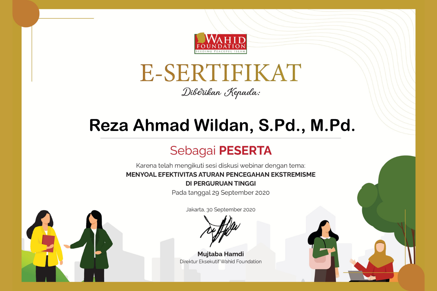 This collection of certificates documents my participation in a series of national discussions and forums organized by Wahid Foundation in collaboration with academic institutions and global partners. The programs focus on critical issues surrounding peacebuilding, tolerance, digital engagement, and the prevention of extremism within contemporary society.