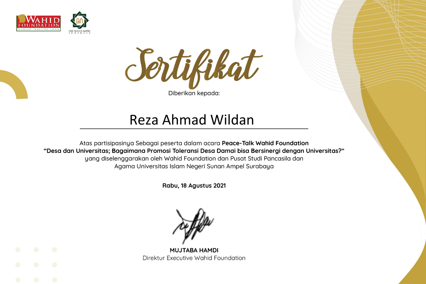 This collection of certificates documents my participation in a series of national discussions and forums organized by Wahid Foundation in collaboration with academic institutions and global partners. The programs focus on critical issues surrounding peacebuilding, tolerance, digital engagement, and the prevention of extremism within contemporary society.